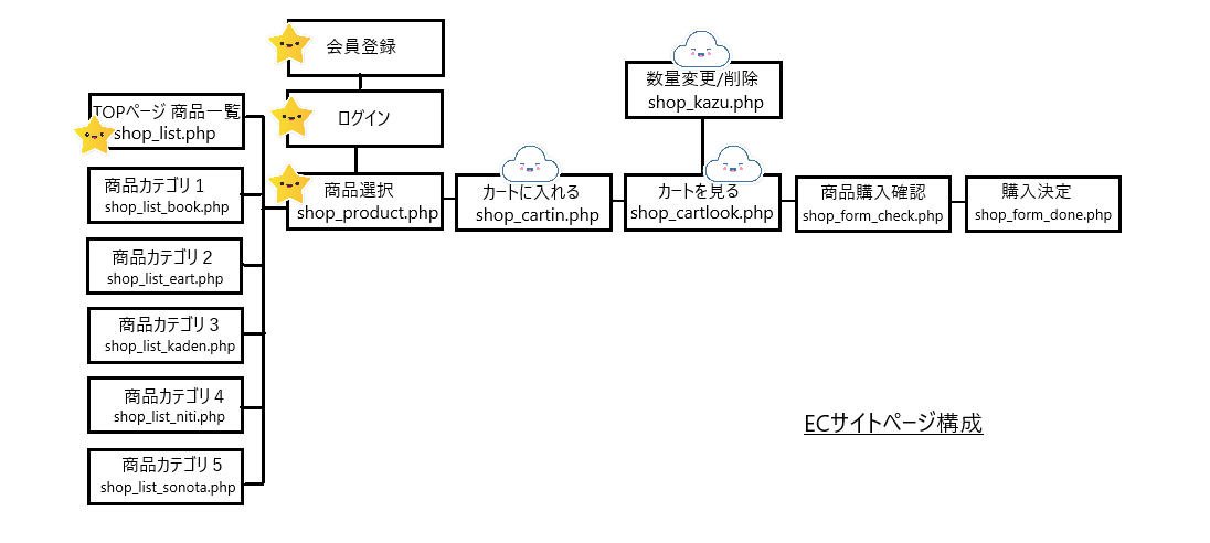 星マークが作成済みのページになります。今回は雲マークの shop_cartin.php shop_cartlook.php shop_kazu.php のファイルを作成します。