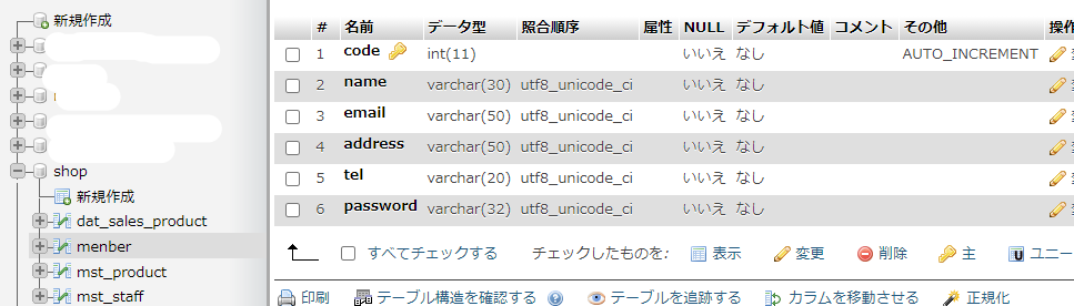 shopのデータベース配下に、会員情報管理のテーブルを作成します。テーブル名は「menber」とします。