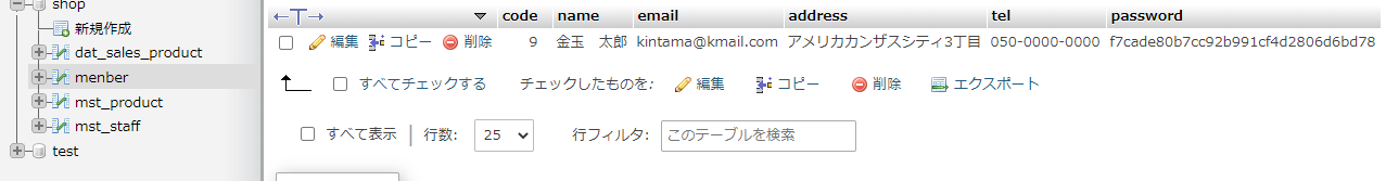 上から順に、会員番号、名前、email、住所、電話番号、パスワード、となります。