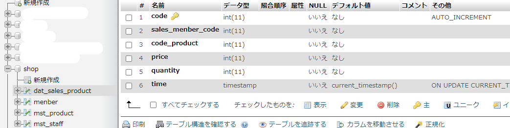 カラムは6とし、下図のように「code」「seles_menber_code」「code_product」「price」「quantity」「time」のカラム名、データ型、AI(AUTO_INCREMENT)を設定します。
