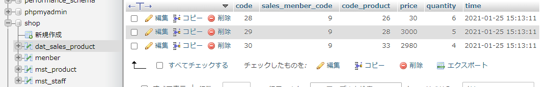 codeにプライマリkeyを設定、seles_menber_codeは会員コード、code_productは商品コード、priceは商品単価、quantityは数量、timeは購入が決定した日時になります。