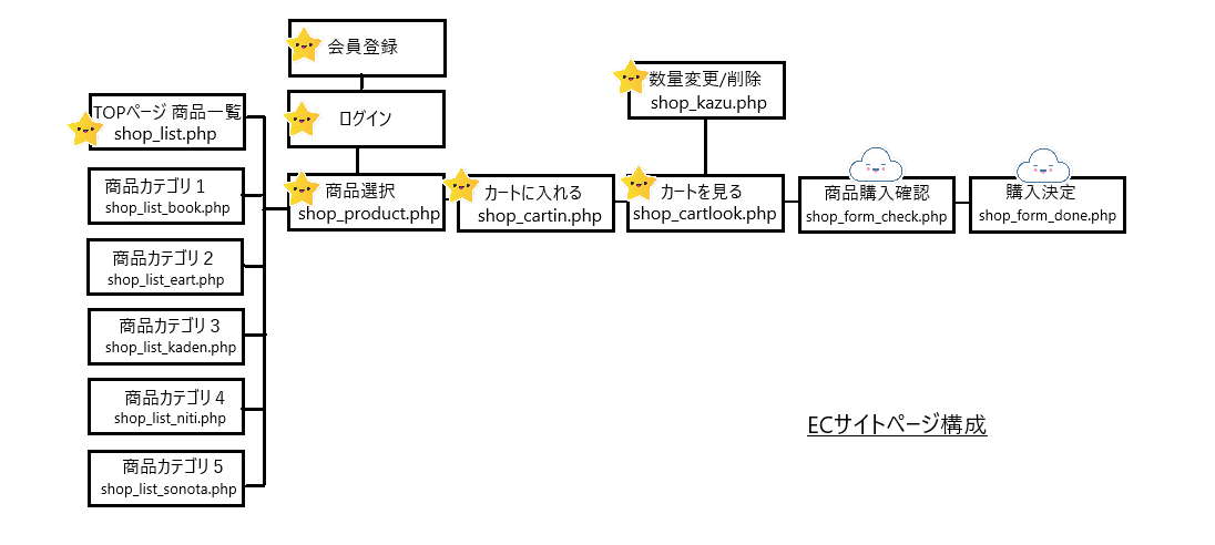 星マークが作成済のページになります。今回は雲マークの shop_form_check.php shop_form_done.php を作成します。