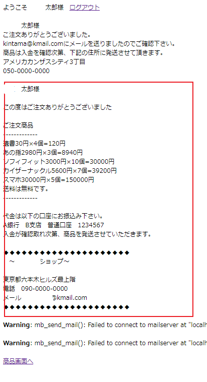 したがって、mailの見出しの部分を記述したあと、データベースに接続し、for文でSQLのSELECTで購入した商品の情報を選択し、fetchで取り出した内容を$honbunに代入しています。これで会員宛てのmailには購入情報の詳細までが反映されます。