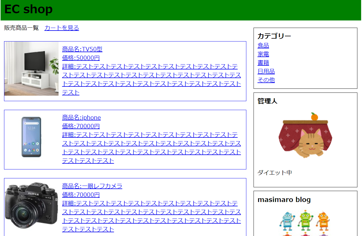 スタイリングはまだしてませんので少し殺風景ですが、一応これでスタッフ、商品管理とECサイトの完成です。