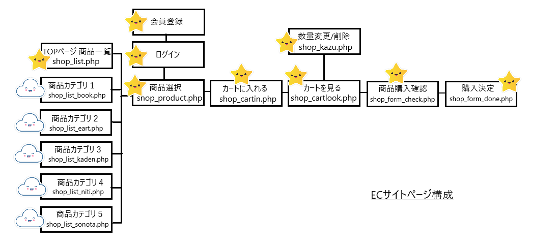 星マークはすでに作成済みのページになります。雲マークの商品カテゴリページを、今回作成します。