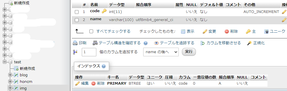 データベース「test」に「img」のテーブルを作成します。カラムは6とし、下記のように設定します。