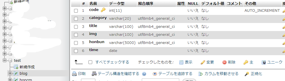 データベース「test」に「blog」のテーブルを作成します。カラムは6とし、下記のように設定します。