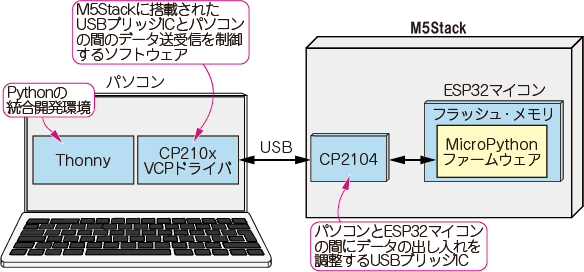 また、pythonのエディタはThoony等のIDEをPCにインストールして使います。なお、Thoonyを使えば作成したプログラムの実行だけでなく、M5stackに保存する事も可能になります。