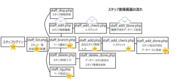 今回は、雲マークのstaff_edit.php staff_edit_check.php staff_edit_done.php を作成したいと思います。