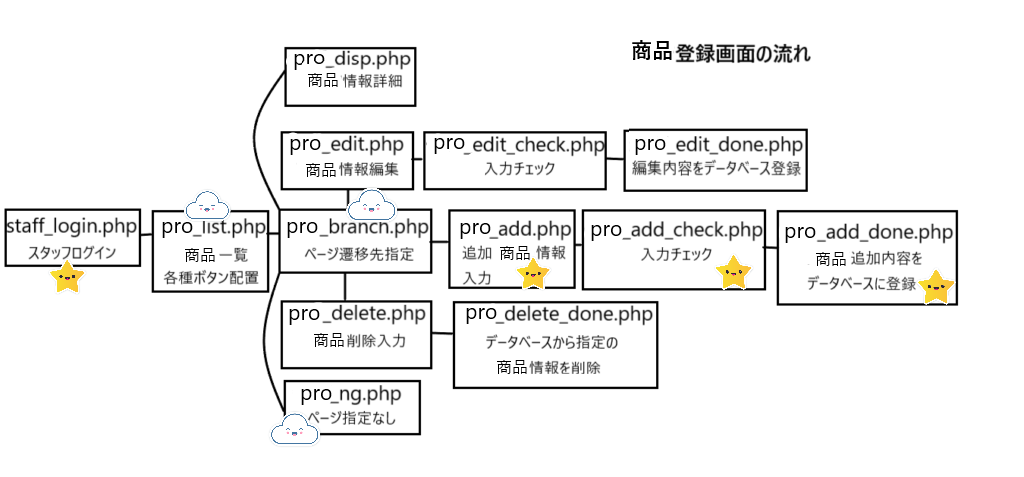 星マークのページは前回までで作成済みになります。今回は雲マークのpro_list.php pro_branch.php pro_ng.php を作成します。