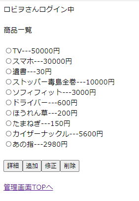 ここまで作成できれば、ログイン後の商品管理トップページから商品追加画面へ飛べるようになるので、pro_add..のページのコメントアウトしておいたsessionの記述部分を解除しておいてください。