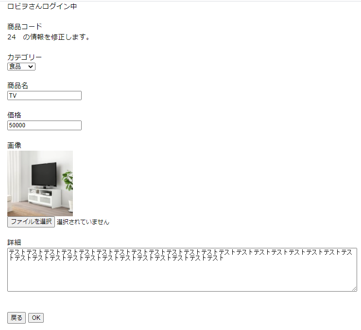 このページは、pro_branch.phpより受け取った商品コードをもとに、カテゴリー、商品名、価格、画像、商品の紹介文、の修正情報を入力する画面になります。pro_list.phpから任意の商品の修正ボタンを押せば、下のような商品の詳細が反映されている画面に飛ぶはずです。各項目を変更できるように、textboxに値が入っています。