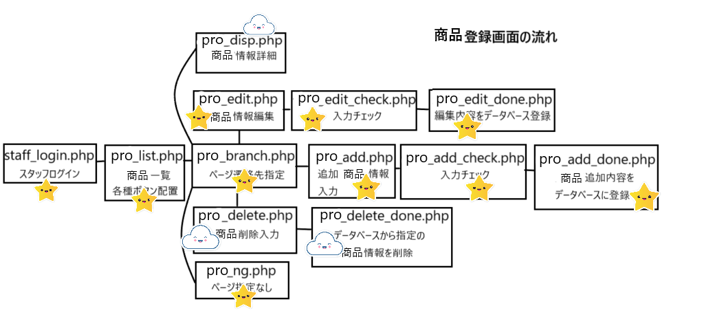 ☆のマークは作成済みのファイルです。今回は雲マークのpro_disp.php pro_delete.php pro_delete.done.php ファイルを作成します。